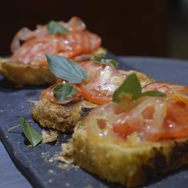 Fatias de pão caseiro, torradas no forno a lenha com tomate fresco, alho manjericão e azeite extra virgem.