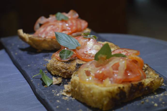 Fatias de pão caseiro, torradas no forno a lenha com tomate fresco, alho manjericão e azeite extra virgem.